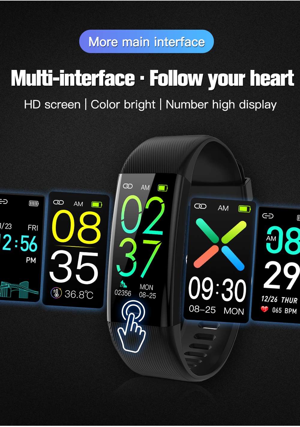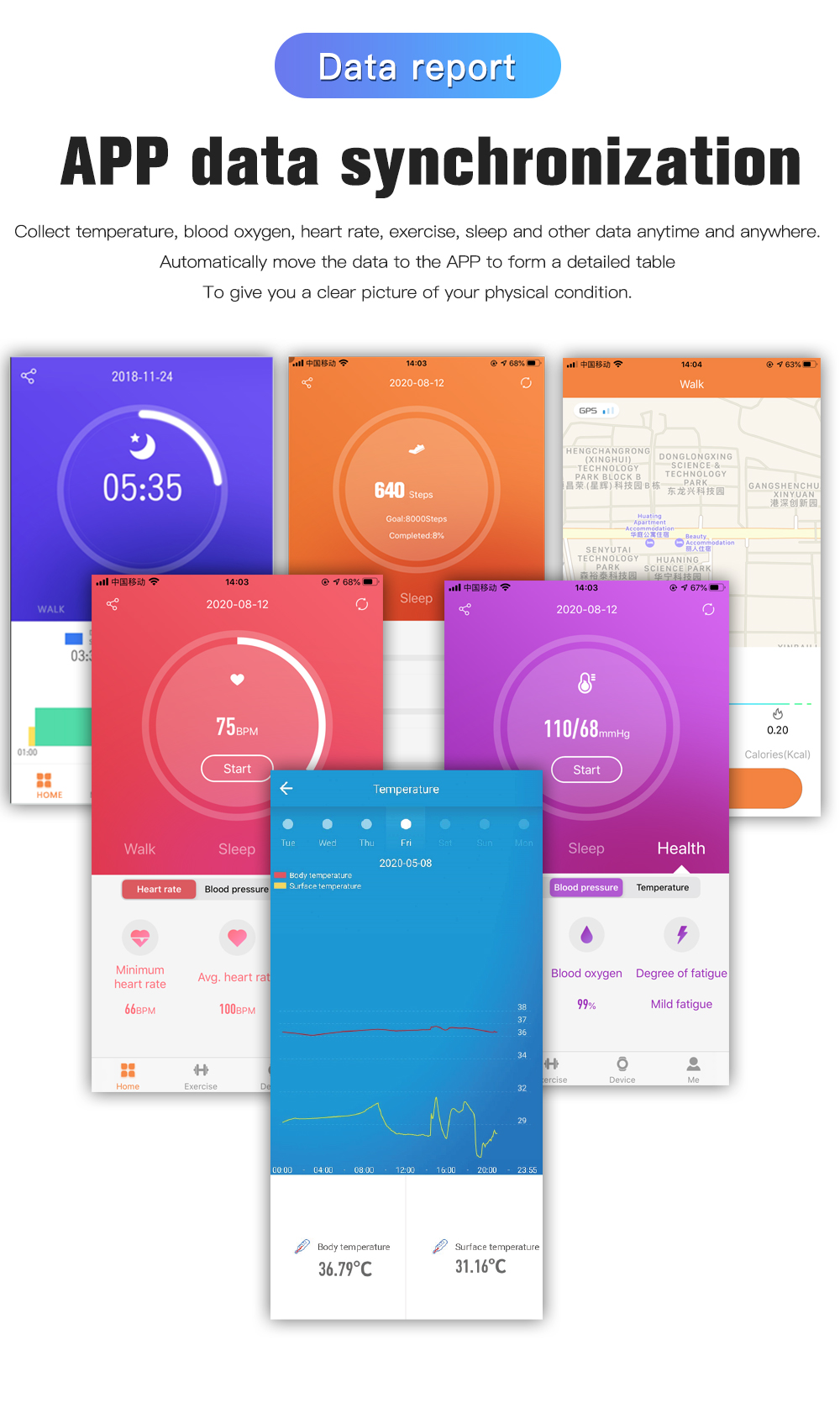 Main Function 24-hour body temperature automatic monitoring, heart rate, blood oxygen saturation, blood pressure, step counting, distance, calories, sleep monitoring, call & message reminders, alarm clock, raise wrist screen, multi-sport modes