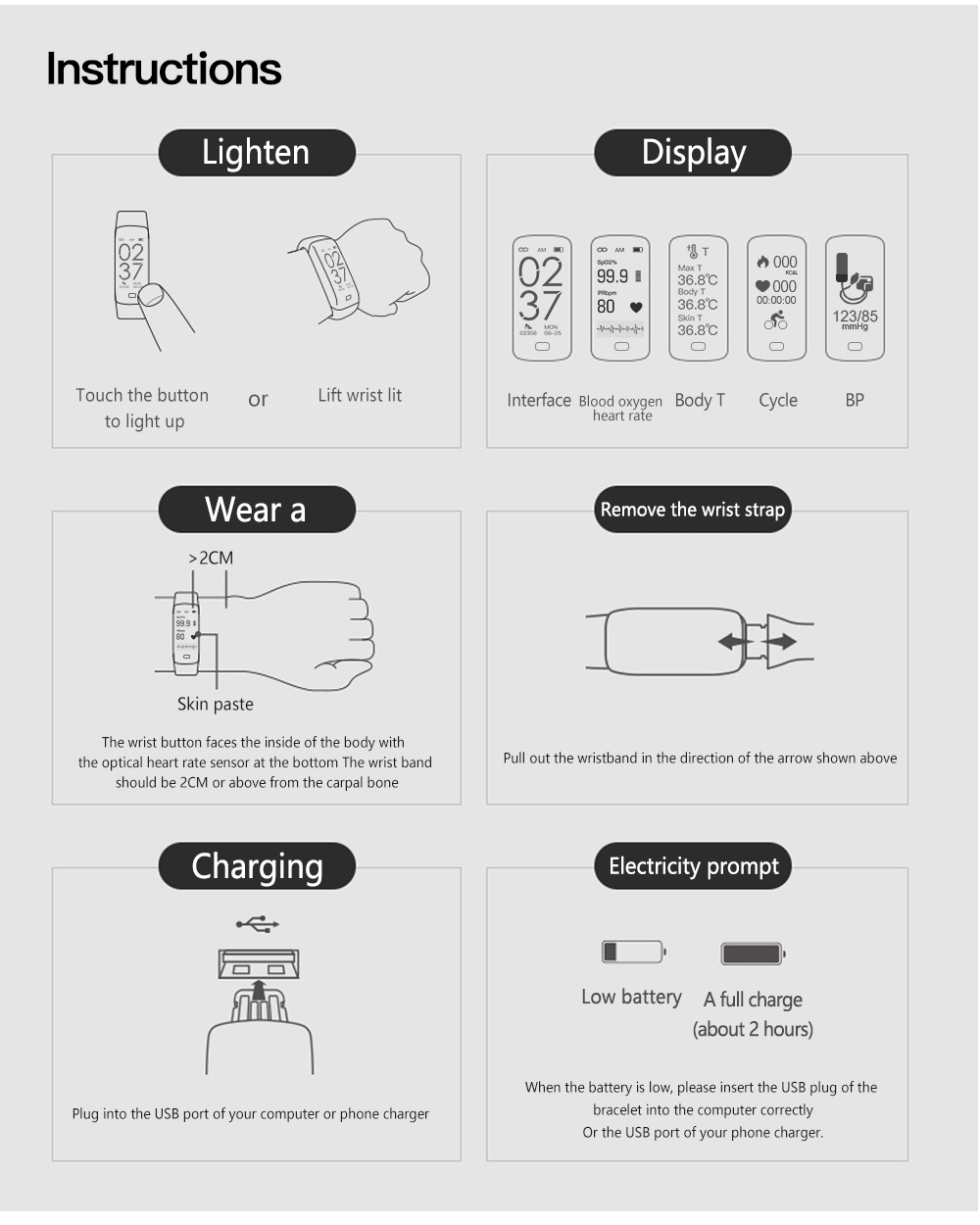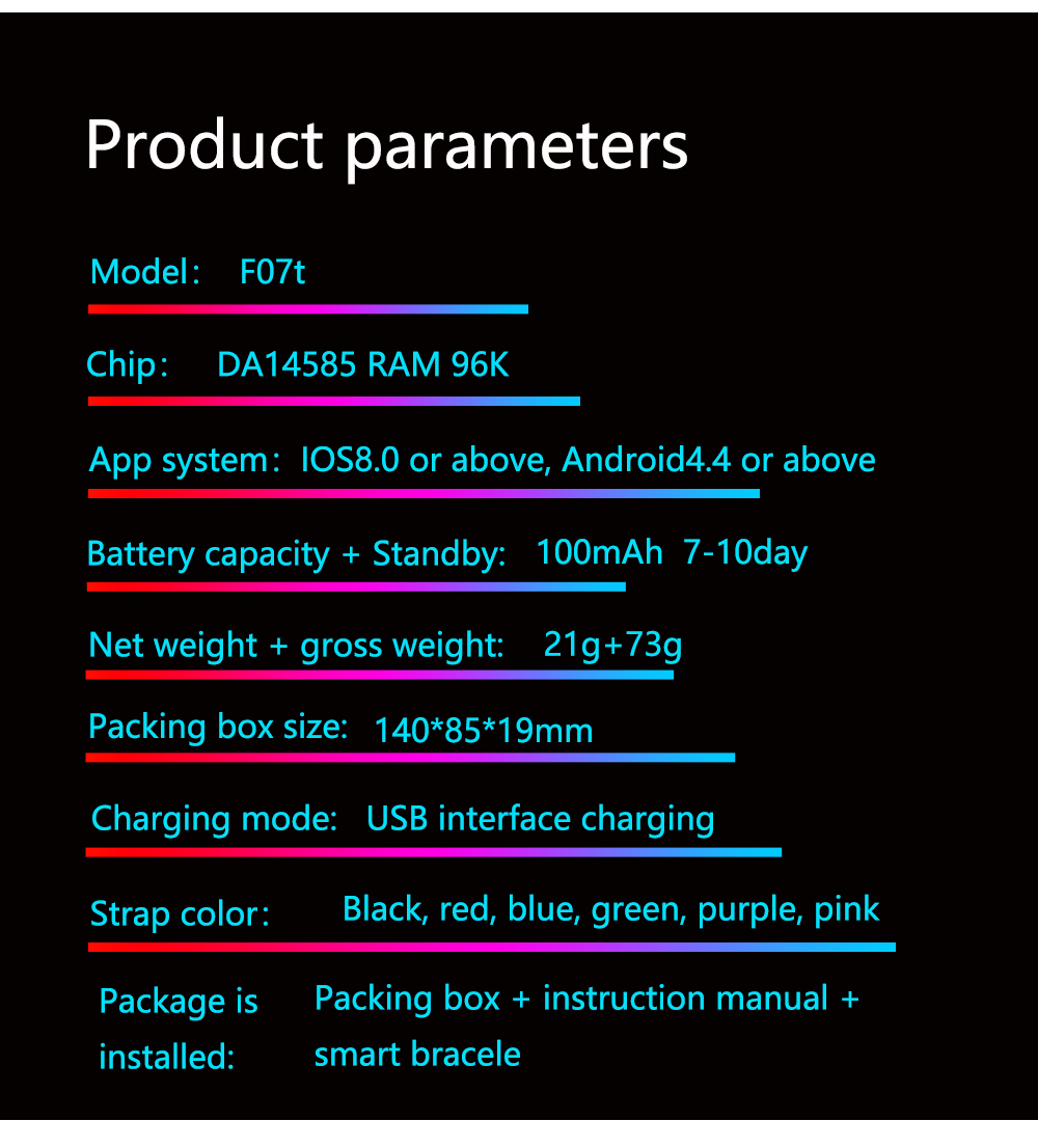 Waterproof rated IP67, this smart bracelet is durable for everyday use. The long-lasting 100 mAh Li-polymer battery offers 7-10 days of standby time, with a quick 2-hour USB charging process. Available in five attractive colors, it caters to diverse market preferences.