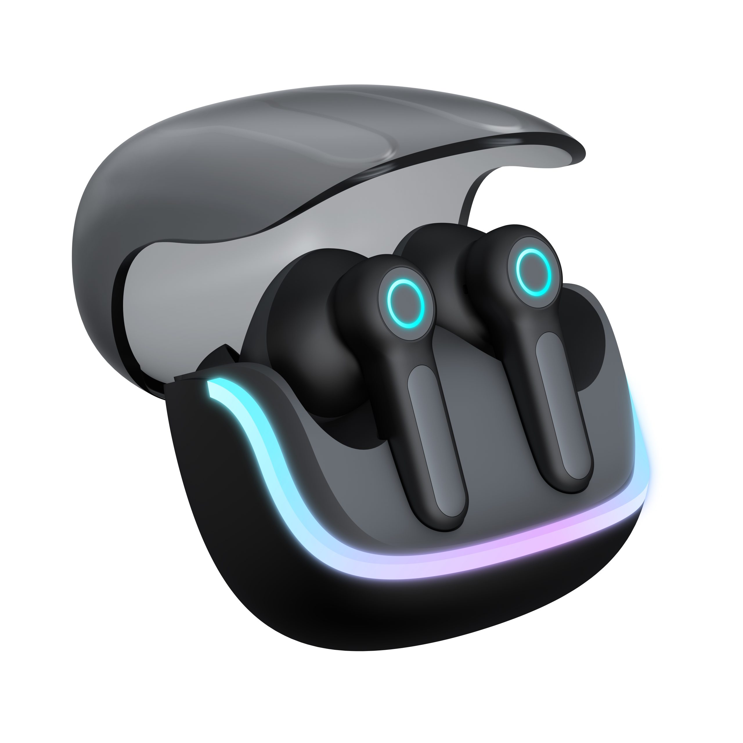 Introducing our cutting-edge TWS true wireless earbuds designed for the modern professional and gamer alike. These earbuds feature advanced ENC quad microphone technology, ensuring crystal-clear voice calls and noise cancellation by utilizing two microphones in each earbud, totaling four mics. The inclusion of RGB lighting adds a stylish flair, perfect for gaming setups or trendy office environments.