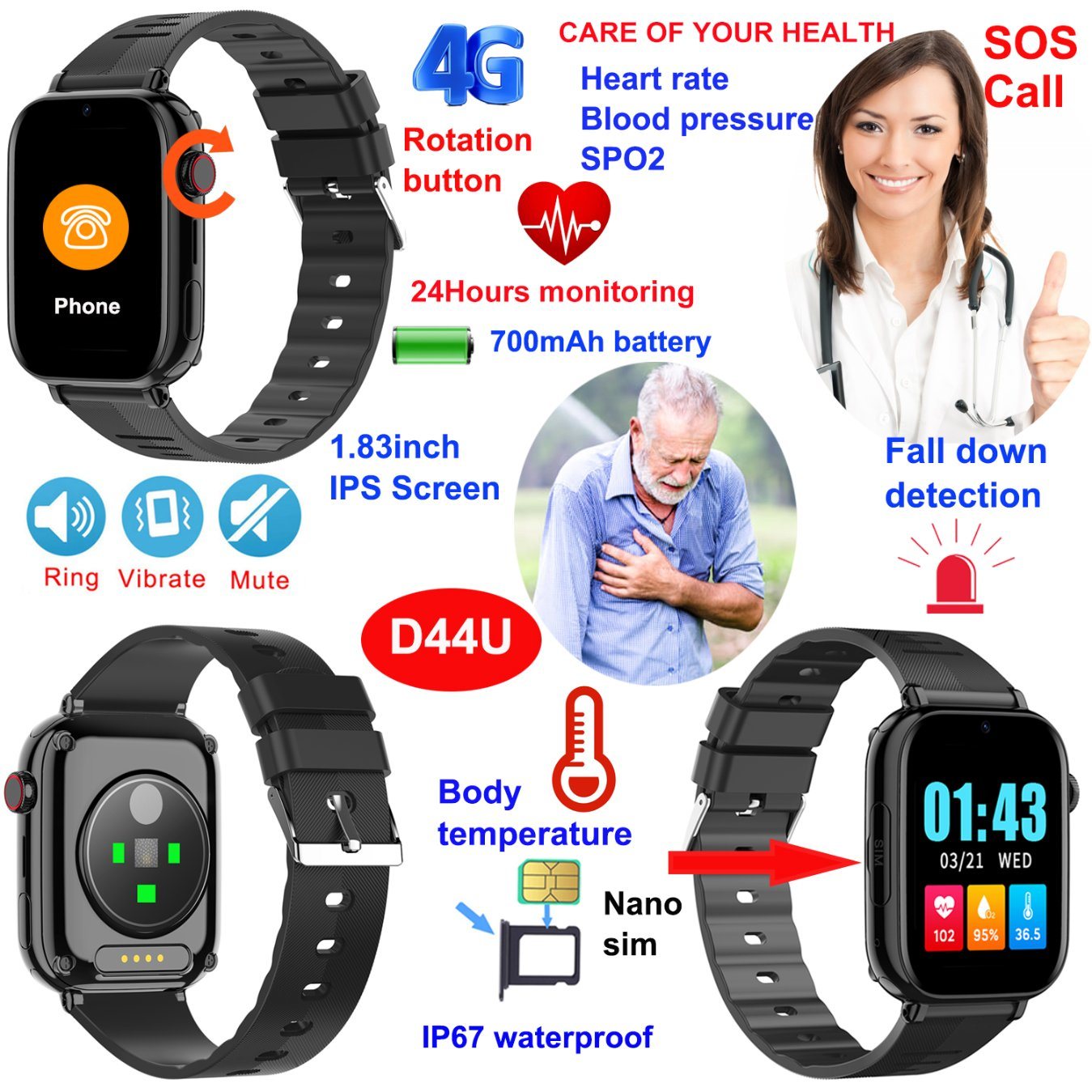 The D44U smart watch is crafted with a waterproof design, ensuring durability and protection against water exposure during daily activities. This feature makes it an ideal wearable device for seniors who require a dependable watch that withstands splashes, rain, or accidental spills without compromising functionality.